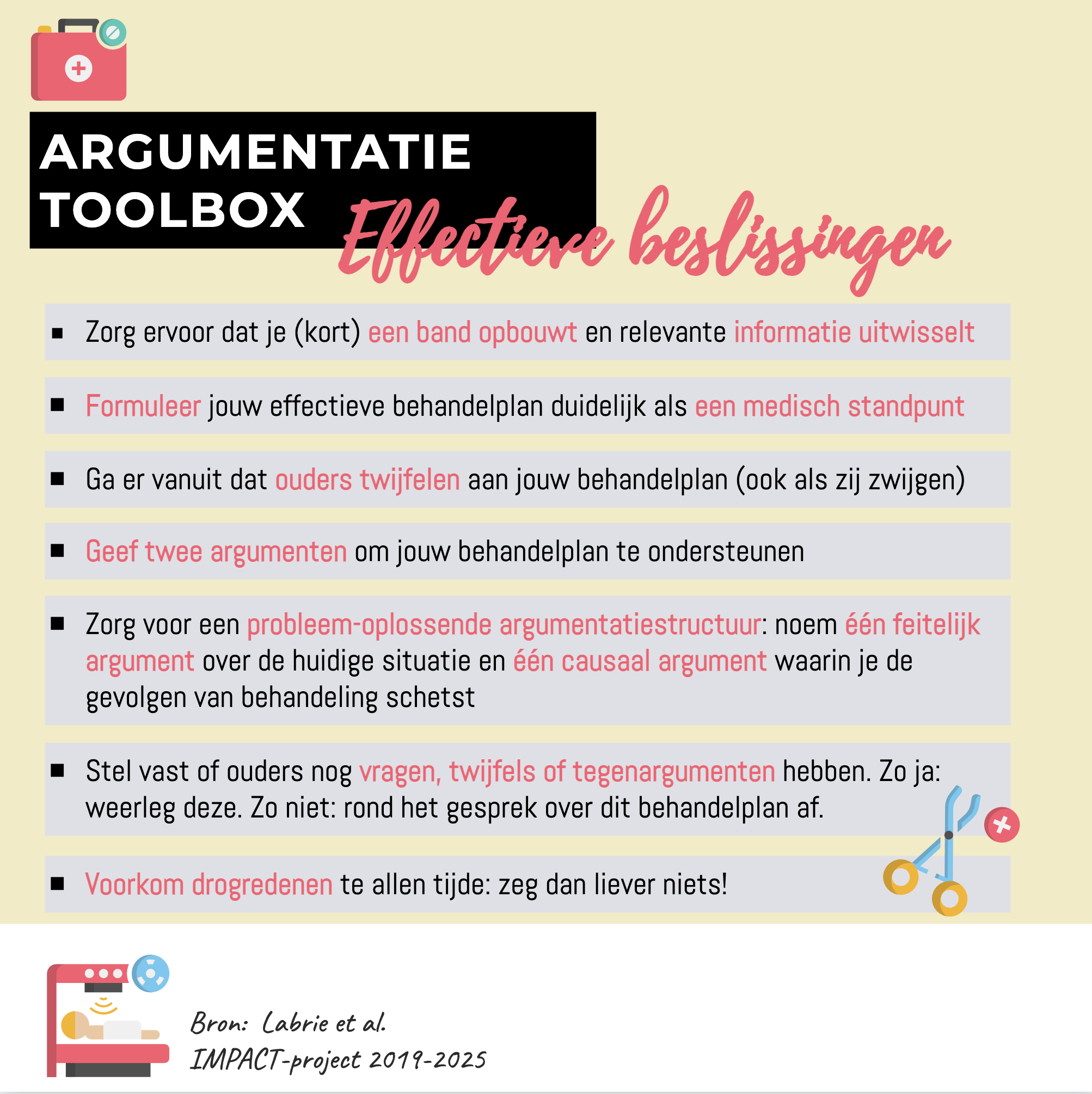Samen met ouders beslis je over de behandeling van het kind. Door behandelplannen met goede argumenten te onderbouwen zet je ouders in hun kracht. Drogredenen als ‘ik doe dit al jaren’ schaden het vertrouwen. Ik ontwikkelde hiervoor: de Argumentatie Toolbox