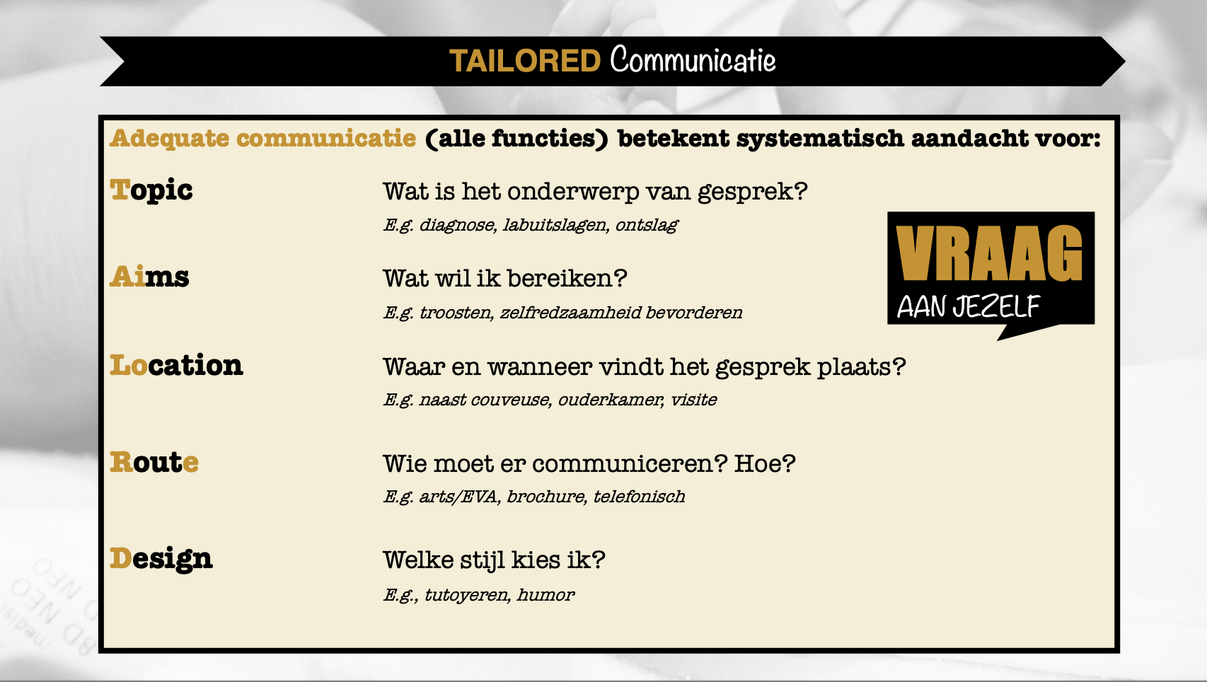 Ouders en zorgverleners zijn eensgezind in hun oordeel: communicatie moet passen bij de persoon. Goede communicatie komt op het juiste moment, op de juiste plek en heeft de juiste toon: Communicatie op maat. Ik ontwikkelde hiervoor: het TAILORED model