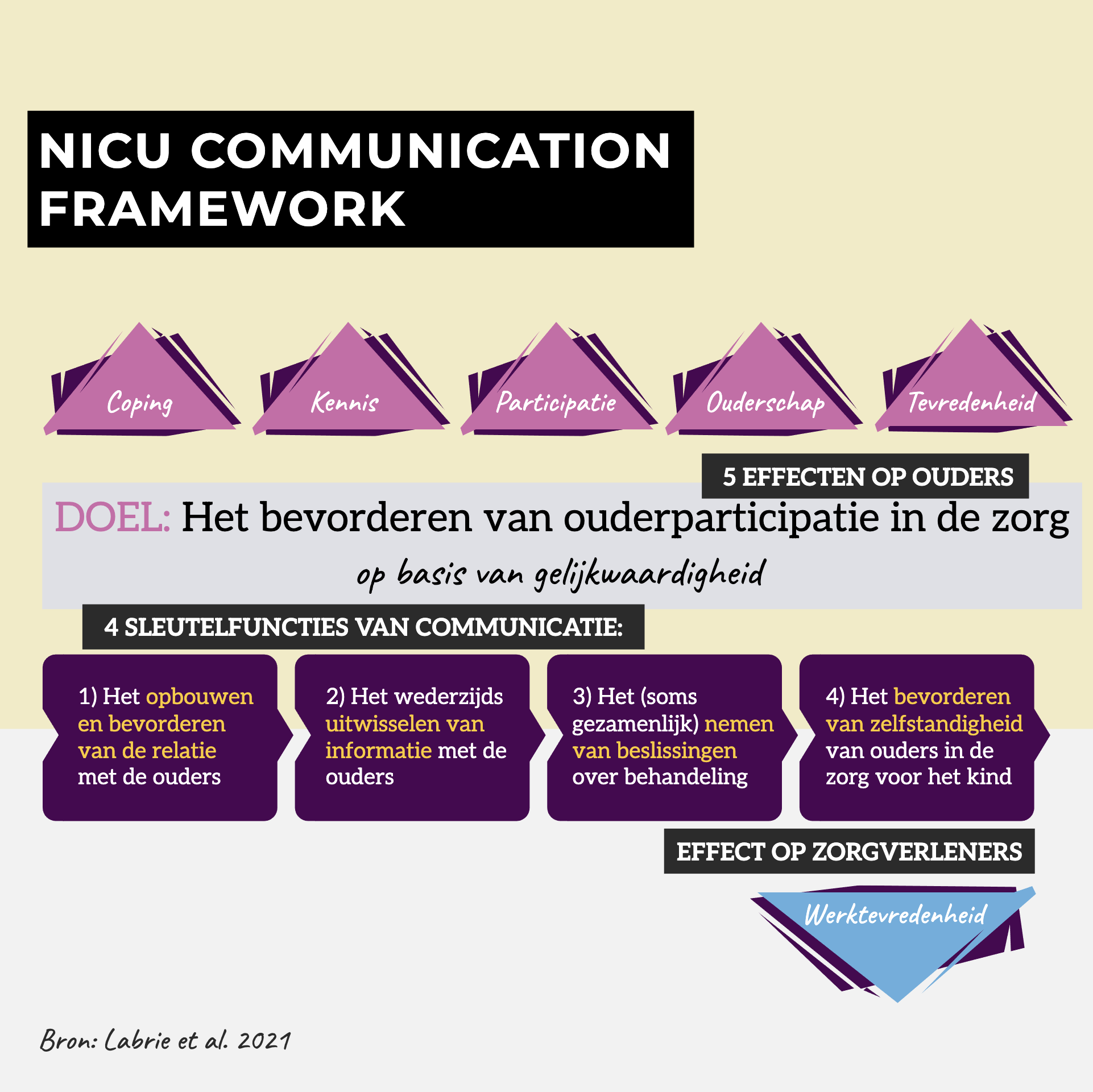 Communicatie heeft vier functies: een relatie opbouwen met ouders, informatie uitwisselen, beslissen over behandeling en ouders coachen. Een goede relatie is de absolute basis. Ik ontwikkelde hiervoor: het NICU Communication Framework